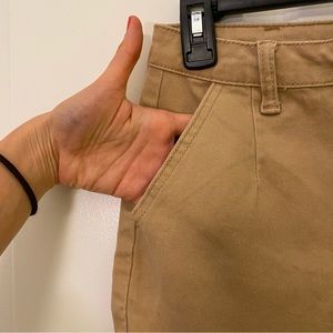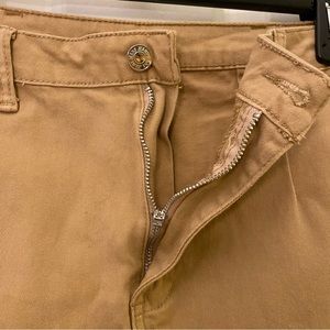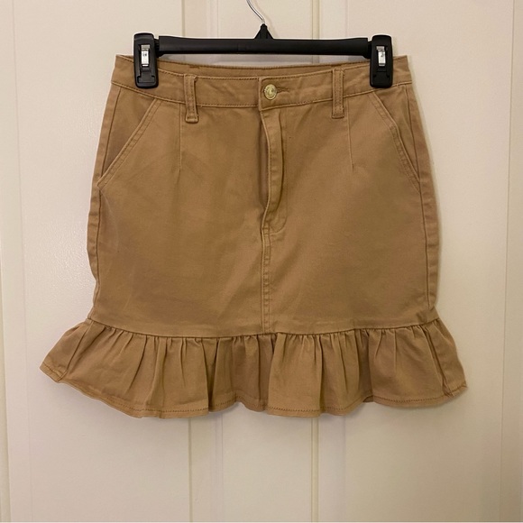 This is a really feminine skirt! High rise, side pockets and ruffle bottom! The tan color is ideal for this fall as well! I did tailor the waist a little bit because I am someone with a big booty and small waist. Size S.