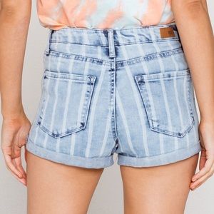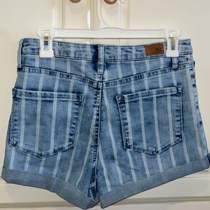 High rise striped jean shorts - VERY stretchy! - medium blue color with pale white stripes - brand new with tags - size 7 / 28W