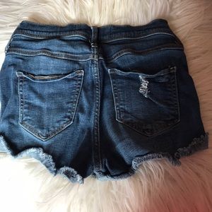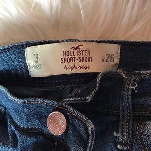 Distressed pair of shorts from Hollister. Size 3, waist 26. High rise short short. Super cute. Stretchy jean material.