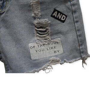 High Rise Shorts M Womens Denim in Light Wash Distressed Cutoff Patchwork style. Made of a Cotton Blend, these shorts offer a stylish and comfortable fit in a vibrant Blue color.