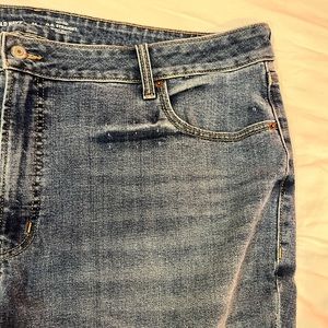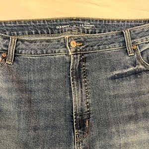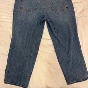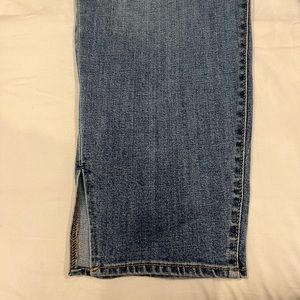 Medium wash jeans with no rips or distressing, zip fly, ankle slit on bottom hems, high waisted fit, straight leg, front and back pockets, never worn before, “High rise O. G. Straight secret smooth pockets” line, 87% cotton 12% polyester 1% elastane