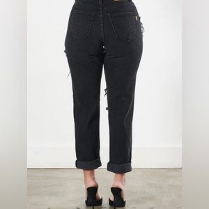 High Rise Relaxed Fit Distressing Throughout Zipper + Button-Front Closure
