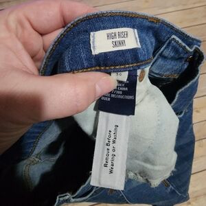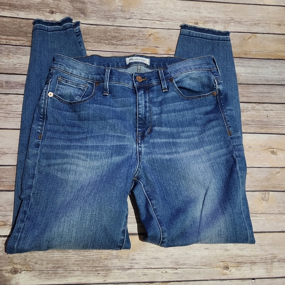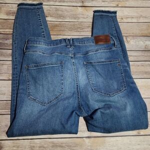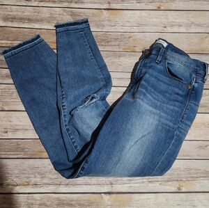 Madewell High Riser Skinny. Medium wash. Distressing over the knees. Frayed skinny bottoms. Very cute. Perfect condition. Box 4 015