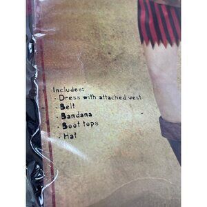 This pirate costume includes a dress with an attached vest, belt, bandana, boot tops, and hat. Crafted from 100% polyester, it ensures durability and comfort for extended wear.