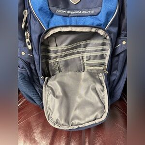 High Sierra Elite backpack "Fly-By" It's designed for travel and commuting, featuring a checkpoint-friendly laptop compartment, a tech zone for tablets, and multiple pockets for organization.