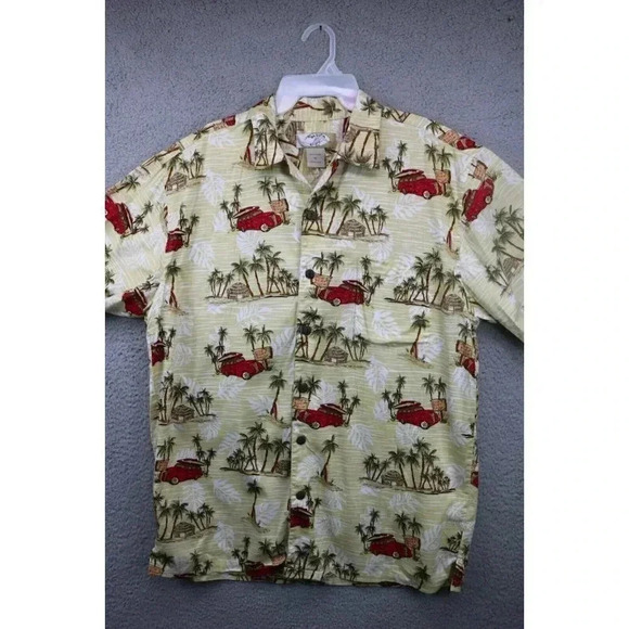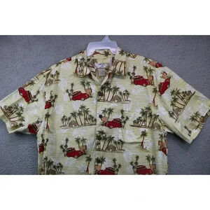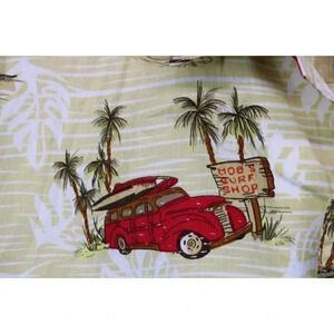This is a Men's Button Up Hawaiian Shirt that is a size XL. It has Bob's Surf Shop, Tiki Hut, Palm Trees, etc. On it. It is 100% Cotton. Laying flat, it measures: Armpit to armpit-24.5" and the length is 31". In Good Condition.