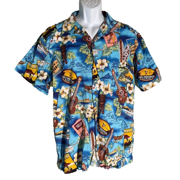 High Surf Men's Short Sleeve Button Down Hawaiian Shirt Blue Floral Ukulele XL