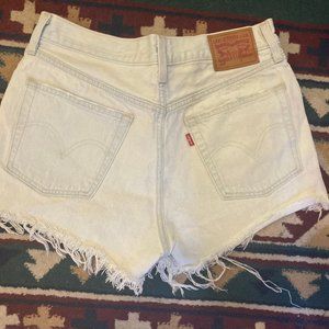 Super cute high-waisted Levi's cutoff jean shorts with button fly and distressing. Very light wash, almost bleached looking, in a nice sturdy rigid cotton.