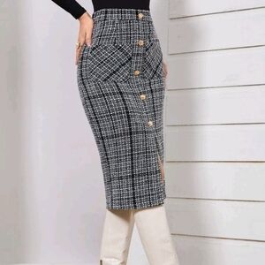 High Waist Plaid Pattern Single Breasted Dual Pocket Tweed Skirt