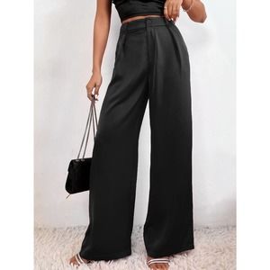 High Waist Plicated Detail Satin Tailored wide leg dress Pants black