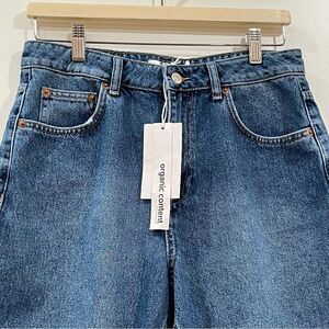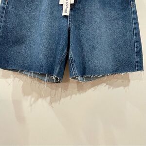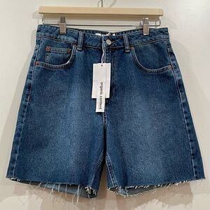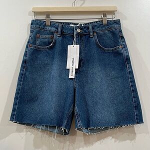 New with tags high-waisted denim shorts with raw hem, mid-blue, 5-pockets. 100% cotton (some organic content). Please double check your measurements to make to sure they fit with: Waist 30”, Rise 11.5”, Inseam 5.75”.