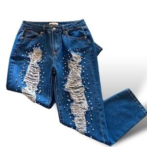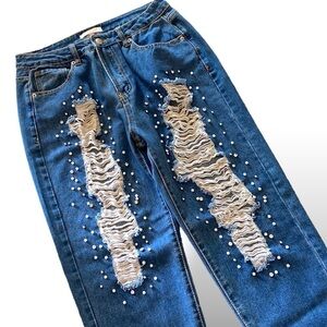High Waist Ripped Rhinestone Pearl & Silver Ball Embellished Straight Leg Jean…