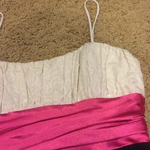 This dress has a cream sequined bodice, and the gathered detailing is flattering on any body type. The skirt is a soft black fabric, with a layer of black chiffon that gives the skirt a soft and flowy look. The pink ribbon sash gathers in the front, and ties as a beautiful bow in the back. This dress is great for dances and parties and would look beautiful on anybody!