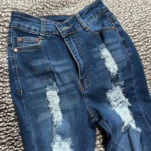 High waisted dark blue ripped skinny jeans.