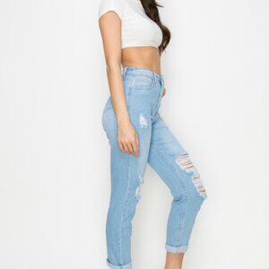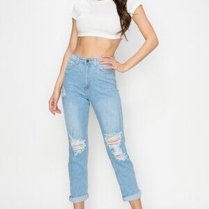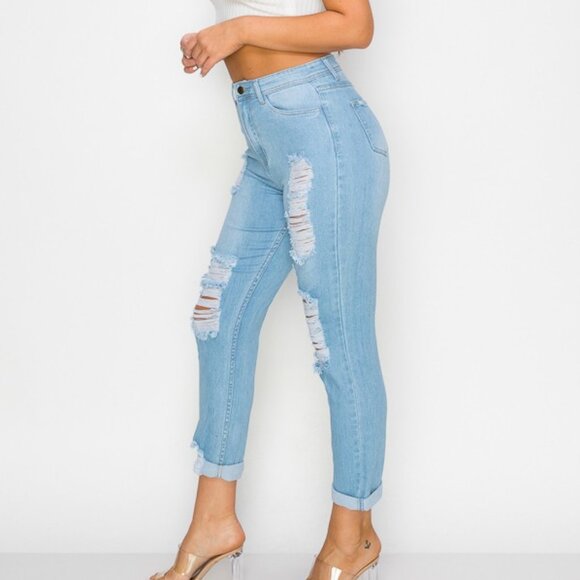Effortlessly chic and endlessly versatile, the Lover Distressed High-Waisted Jeans are your new denim essential. Designed with a flattering high-rise fit that cinches the waist, these light-wash jeans feature artfully placed distressed detailing at the knees for a laid-back, lived-in vibe. The straight-leg silhouette with cuffed hems offers a timeless yet trendy look, perfect for pairing with everything from cropped tees to oversized sweaters.