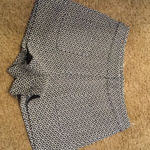 This navy geometric print short features two fully functional pockets. Added hook and eye closure above zipper for better fit. Excellent quality. 2" inseam. 90% polyester 10% Rayon