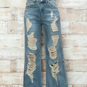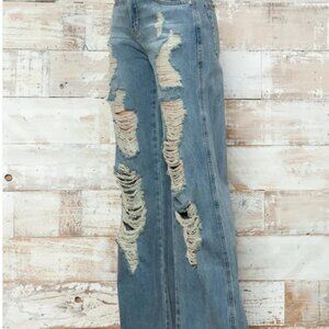 High Waisted Heavily Distressed Wide Leg Denim Jeans
