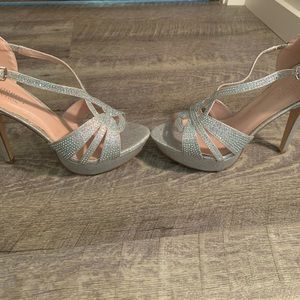 Worn once and that was for a wedding, very beautiful and formal. Sparkly and eye catching. The heel is around 4 inches tall. Perfect condition just don’t have tags.