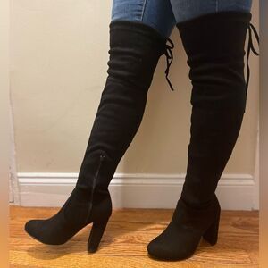 High heel Knee high solid black soft suede boots tie up autumn party block heels