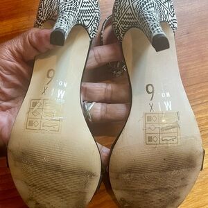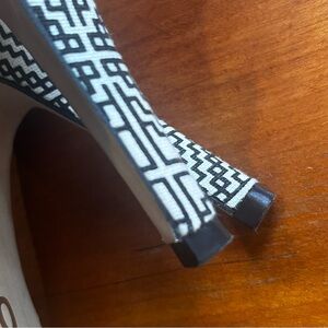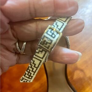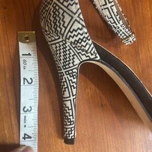 Super cute and sexy open toed high heeled sandals. Black leather upper with a fabric tan/black print. Soles are man made and the straps are adjustable. Worn a couple of times. Shoes are in excellent condition. Thanks for checking out my closet.