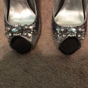 Sequined and rhinestone high heels! Slight wear on the bottom soles and heel of shoe. Rhinestone details pictures. One very small stone missing from the right shoe on the side, but it’s not very noticeable. Heel is almost 5”
