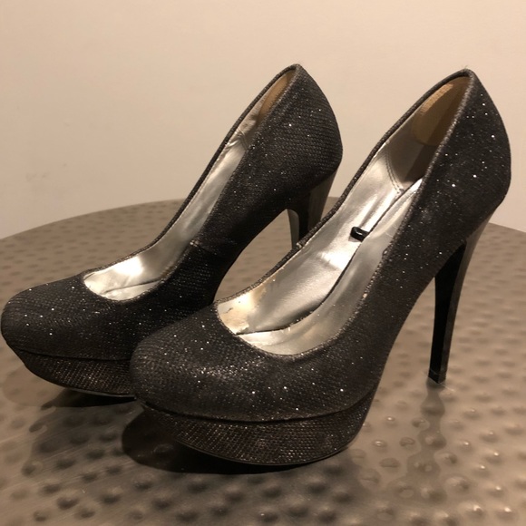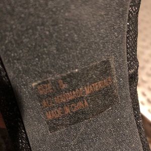 These are worn twice for a very short time around my house for a party. plastic tag still attached to bottom. These are not for me. I like peep toe shoes. Black shimmer size 8. Bought at body central. Weird my big toe rubbed inside lining and tore it. See pics. Lining was cheap but you can’t see that from outside of shoe