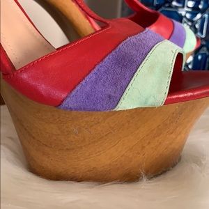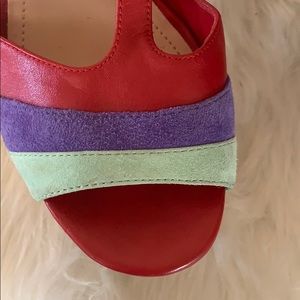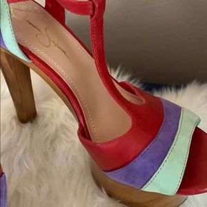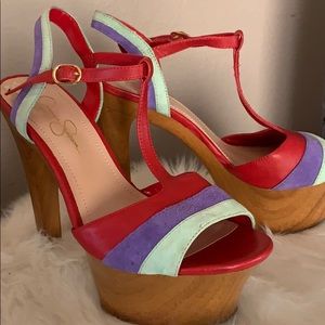 Jessica Simpson High heels, size 8. T strap, wood heel. 3 inch heel. Red, purple, and mint strap around toes and ankles