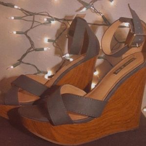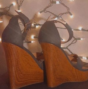 They are used and in good shape and fit well.The print is brown wood and dark blue straps the heel its self is 5 inches.Nice dress shoes!!