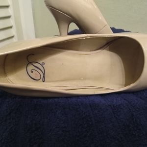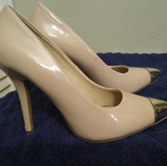 Pair of peach colored high heels.