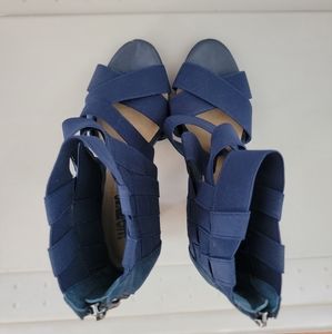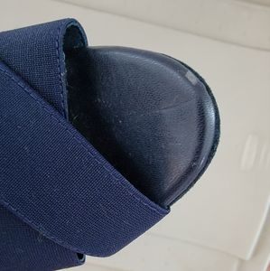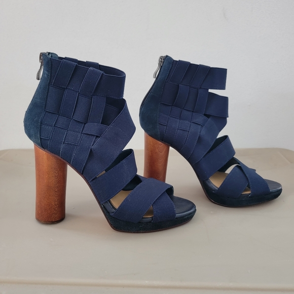 Wooden heels with elastic upper. Elastic is a criss cross pattern. The edges of the sole and the back have a navy blue suede detail. Brand new. However there are imperfections which are shown on the images.