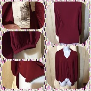 Burgundy makes for a rich looking blouse. Mandarin collar that leads to a diagonal wrap closing, which is tacked closed at the top and gives a flouncy hem in the front. The long sleeves end with a fitted band hem. The longer back hem is a straight cut. 95% polyester and 5% spandex. Made in the USA. Machine wash warm and tumble dry low. Bust is 32" front length 22" Back length 26"