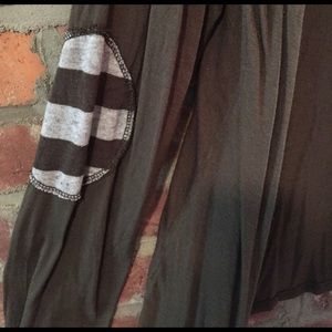 Army green high low cardigan. Striped elbow pads. Size XXL. Worn. Good Condition. Smoke free home. No tag showing size.