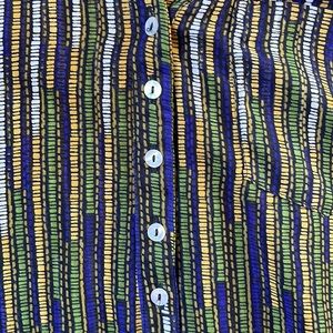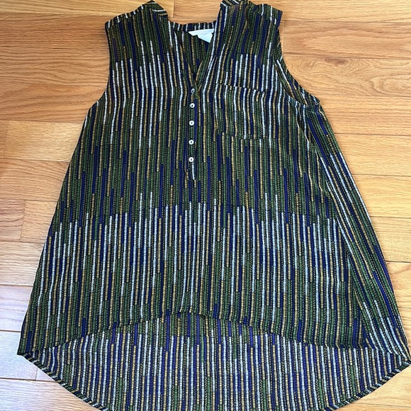 Super cute multi colored v neck tank with button detail. Pair with white pants and jean jacket!