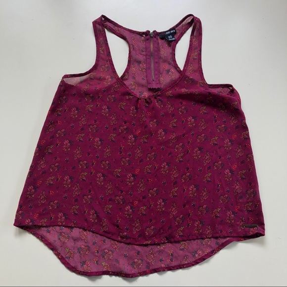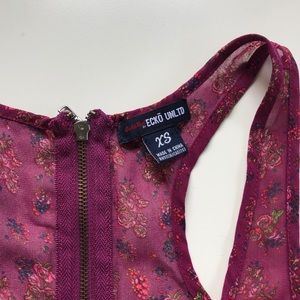 Floral semi sheer top. Longer in back and shorter in front. Zipper detailing in back. Size XS