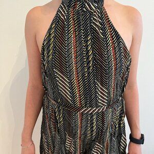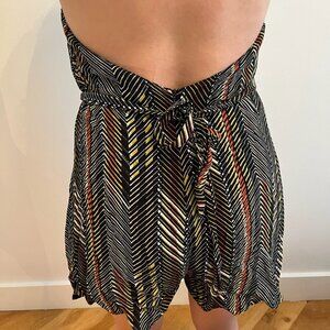 Striped orange, yellow, white and black astr the label romper. Can be dressed up with boots for a spring look or down with sneakers. Sexy back and high neck with buttons on back of neck. Used three times with a little frayed around buttons.