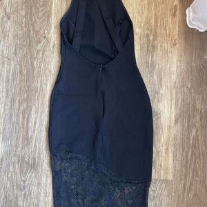 High neck low back black midi dress with a bodycon fit and lace bottom