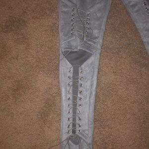Grey suede pants with laced up legs. Very soft and comfortable. Zipper on side to get them up & down.