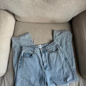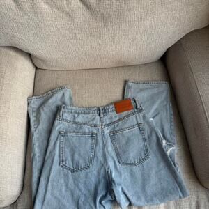 High waisted distressed blue denim jeans