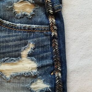 High waisted distressed denim shorts with bead deatiling on the sides. A few beads are missing as pictured but you can barely tell. My favorite shorts, they're just too small for me now!