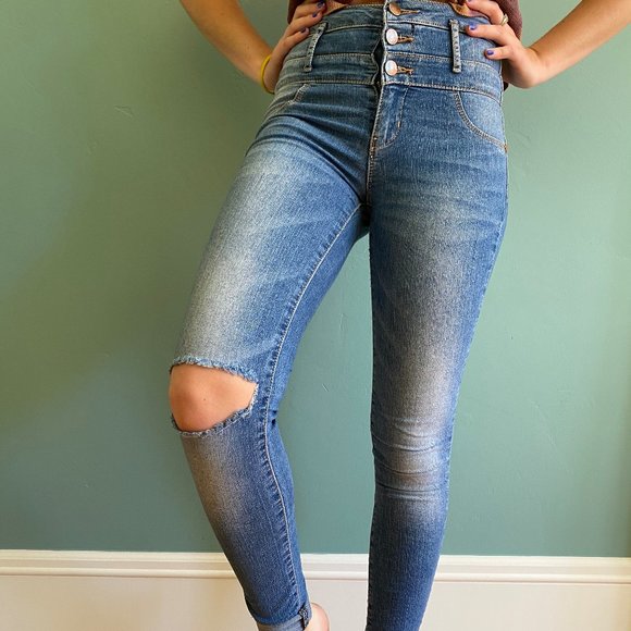 Adorable high waisted jeans with three copper buttons and cute stitching! Soft, stretchy material great for moving around.