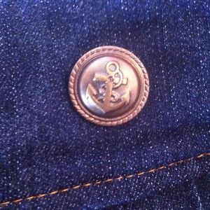 Navy blue jean fabric , stretchy waist, sailer buttons , zip up in the front , front pockets. Cute for summer !