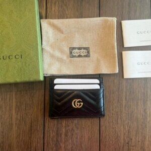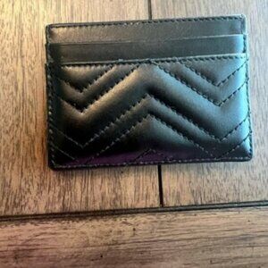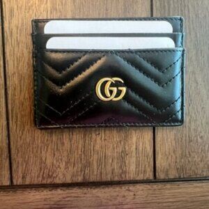 Organize your cards with high-end style using this Gucci black leather card organizer. The iconic GG logo and luxurious quilted finish reflect superior craftsmanship, ensuring both beauty and durability.