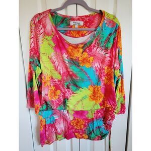 High Fifth 1X Colorful Top Tropical Print Stretch 3/4 Slv Rayon Blend Palm Frond