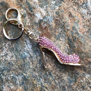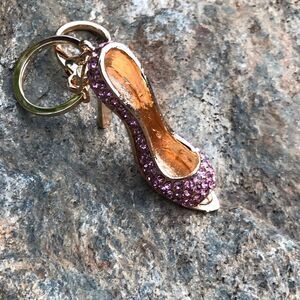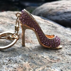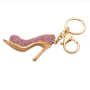 The whole keychain measures 5 inches long. The high heel shoe itself measures 2 3/4 inches long and 1 1/2 inches high
