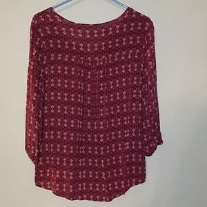 High-Low Bohemian Maroon blouse, laced border across the collar bone, three quarter length sleeves with elastic at the forearm