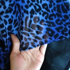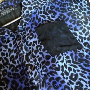 Sheer button down collared shirt high-low style with front pocket, blue cheetah print in front and sheer black in back