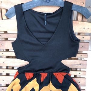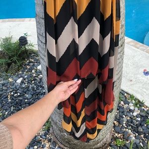 Beautiful fitting dress with sides and back a little exposed. Bottom portion is a polyester chevron print that’s short in the front and long in the back.