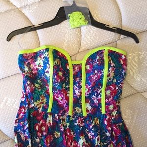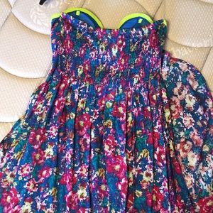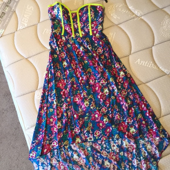 This cute high-low dress is strapless, but has straps you can attach. This dress has never been worn. Perfect condition. New without tags. Can fit small to medium builds.