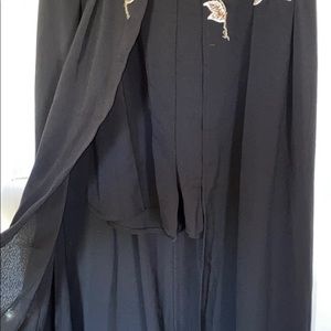 Spaghetti strap top with shorts underneath a wrap around long skirt. Also flower detail on front top.