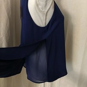 Lovely flowy sleeveless A-line blouse with two sheer'ish layers. Top layer has splits on sides displaying inner layer when in motion. Subtle pretty stitching detail along neckline hem but note that it came with two tiny spots where that stitching is unravelled (see close up picture). Color is a purplish blue.